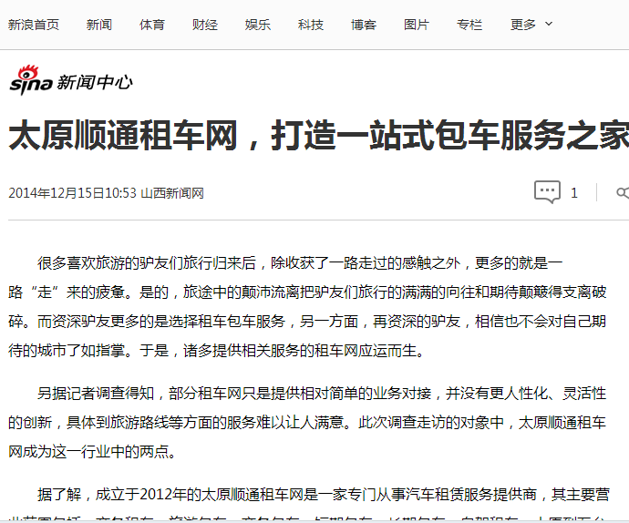 太原順通租車獲得新浪新聞,山西新聞網(wǎng)權(quán)威媒體專訪報(bào)道,特以此鼓勵(lì)公司全體員工再接再厲,在創(chuàng)佳績!